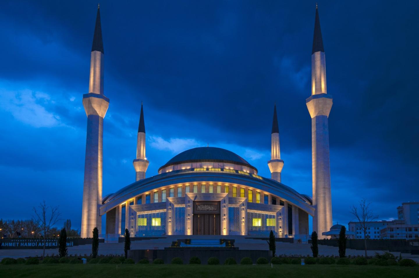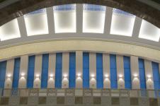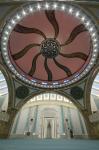 Interior lighting approach was to create a simple, calm and peaceful environment. Daylight and artificial lighting were designed in combination. Contrary to what is usually encountered, no chandelier was used in the design. Prayer areas were lit evenly by double-focus downlights placed around the dome. Indirect lighting was used both in horizontal and vertical planes to enhance the architecture and create calmness. White the dome was homogenously lighted by RBG fixtures which offers different color options, the center-piece of it was accented with narrow-beam projectors from four vaults.