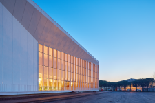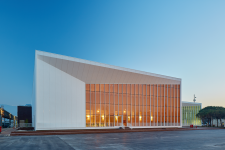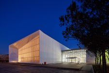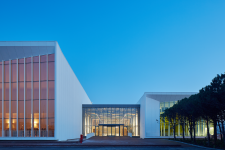 The overall configuration of the Sports Hall is comprised of two main volumes which are connected through a smaller lobby. These volumes are then wrapped with low rise offices and service facility that are covered with pressed brick. With the continuation of the pressed brick material in the ground coverage, a holistic sense and visual continuity is achieved throughout the project. The two volumes are elevated off the ground with shallow pools encircling the front façades of the buildings. The reflective surface of the pools creates visual depth while aiding in the elevated effect.