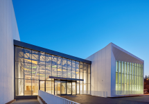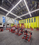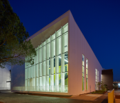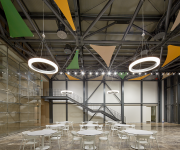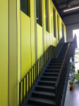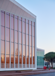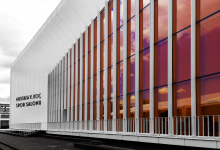 The smaller volume with the green colored façade, contains the fitness and supporting spaces of the facility, while sitting further back and creating a sort of entrance inlet/outdoor space. These colored glass façades change tone with the sunlight throughout the day, creating an animated and dynamic façade.