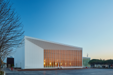The two main volumes are covered in a white shell, which take reference from the existing factory buildings, with the front colored façades angled to face the direction of approach to the site. The larger volume with the orange colored façade, contains three basketball courts and sits closer to the road with an effort to bring it to the forefront.