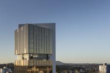 Conceptually, the Golden Tower Corporate Building designed by Torres & Bello Architects and built by Finger Engineering, consists of two triangular prismatic volumes generated through a perfect cube, the front volume reflective glass, comes in contrast to the more sober and solid volume and monolithic lateral facade.