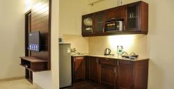 The interiors of the rooms are designed to be reminiscent of home styling and are laid out in three different types of configurations – twin room, double room and suites. Each room is brightly done up with high ceilings and large windows that bring in ample daylight. The contemporary interiors include a combination of wooden & tile flooring and a complete modular kitchen equipped with all appliances. Further, through use of wall paper, painting and lamps, the room gets augmented with warmth and character.