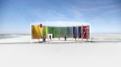 As we move through these uncertain times, we all need a place where we can find happiness. As you enter this joyful refuge, you find yourself surrounded by colorful draperies, flowing in the wind and reflecting their colors onto the interior of the metal sheets, while a warm orange sun emerges above. Generous proportions enable social distancing, while the embrace of the structure maintains intimacy and warmth. Not only a shelter from the elements, this refuge provides a space for surprise and reprieve, inviting you to relax and smile.