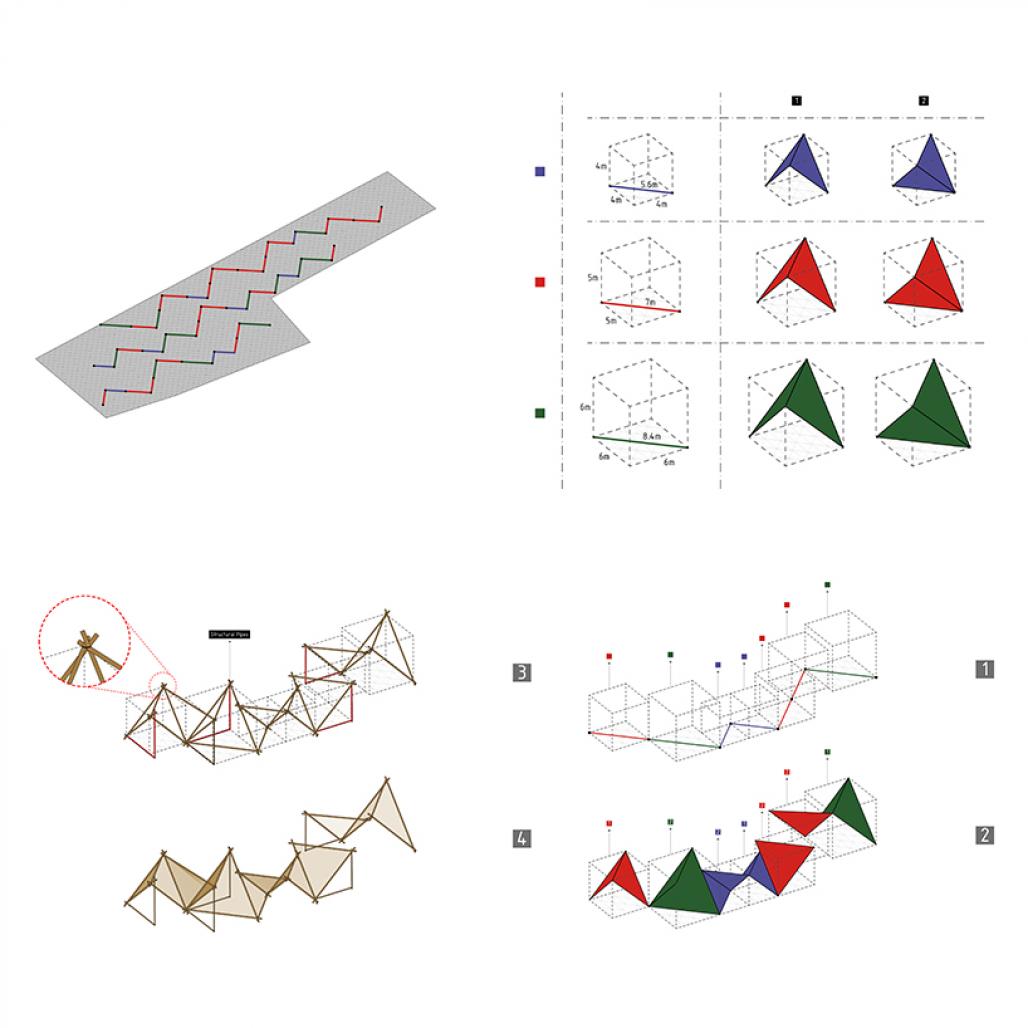 In the next step, with the method of squaring and triangulation, the left-right lines have a three-dimensional nature, and due to the limitations in native materials, different dimensions are considered for triangulations. Creating triangles defines the organization of spaces, and this organization in the project is considered as a free platform that has been used as a potential to meet the social needs and greater comfort of users.