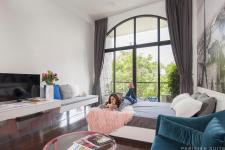 The Parisian Suite re-imagines the romance and poetics of the timeless Paris architecture in a modernized way with high ceiling, curving walls and vaulted doorways in combination with stone claddings, polished wooden floor, nice curtain and fabrics made a luxurious and elegant living space. The balcony is designed as a small French rose garden with beautiful view to the parkland.