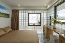 The second level accommodates the cozy master bedroom suite with a landscaped balcony. The bathroom is a minimalist design featuring a delightful glass-block shower. The sunlight is filtered by the plantings as well as the translucent glass-blocks facades before lightening the interior space. The glass windows in various sizes are wisely positioned to open the view to the landscape yet avoid direct sight from the neighboring houses to enhance privacy and comfort.