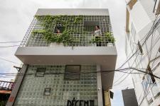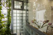 The pergola on the top is a feature element of the built-form. The design of pergola is based on the square shape of the glass-block and considered as the outer skin of the façade which gives space for desirable plantings, enhances the privacy, and minimizes the heat gain to the interior space. The dimensions of the square windows are multiplied by the 190Wx190H mm dimension of a glass-block. The windows not only allow for natural light and ventilation but are also considered as connectors between the indoor space and the outside.