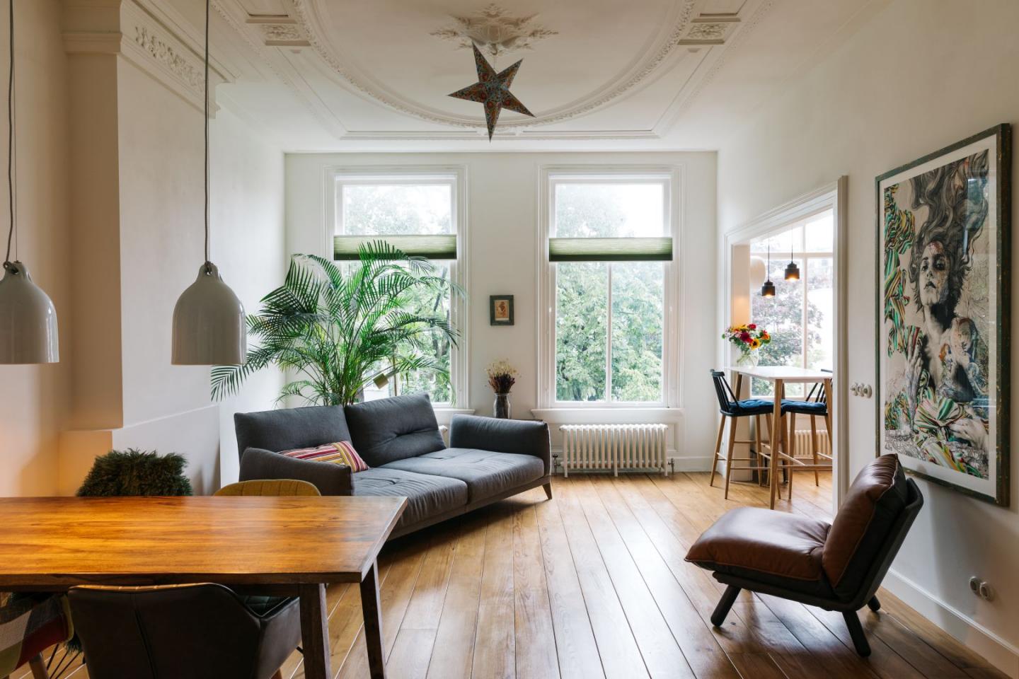 Located on Ceintuurbaan, a typical Amsterdam building is housing this cosy home for a vibrant couple. Over a typical street and facing a beautiful greenery, it is a very characteristic building. In parallel to the architecture, the interior is also full of character. With huge windows and high ceilings, the flat is very spacious and full of light.