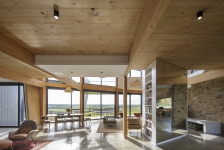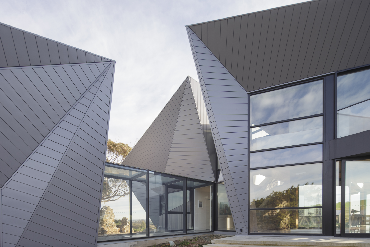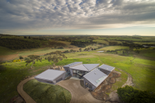 The concept was inspired by the aspirations and brief of the clients and the environmental context. This context enjoyed 360 degrees views of the Barabool Hills in Ceres and the beautiful late1880's house ruins. The giant pavilions emulate the boulders that exist on the land. They reflect indirectly the Boolgiants that according to legend lived in Ceres. This playful cluster design of pavilions maximized the North orientation, disrupted the wind turbulence on the hill, and integrated biophically with the surrounding landscape. Repurposing the scattered limestones from the old ruins as support for the stairs in the new house, consolidated a sense of history, belonging, and continuity of the site's Indigenous and colonial past. The Royd clan's house is an autonomous house completely off the grid. Passive Design Principles were applied to the design of the house and the farm. The house is self-sufficient as it relies on harvesting its own water, generating its own energy, and generating even an income from the farm native flower business. Over 2500 native trees were planted to further sequester carbon and make the farm carbon positive. Compressed Laminated Timber (CLT) panels and Glulam portals for the structure relied on Design forManufacturing and Assembly (DFMA). All timber was cut precisely in factories and assembled on-site to suit the design geometry with minimal transport trips. Choosing CLTwas crucial for the sequestration of carbon, for its insulation value, thermal mass index, and biophilic properties.