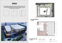 First, create a corridor that separates it into two separate blocks. Then, divide the function, for shopping and an open space associated with the green area. Next, Divide the two areas with two separate material colors. create lightness for the green space. Final. Using simple lines, create a special highlight for the work. PICK.