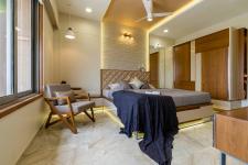 Master bedroom is defined with soothing tones and clean design. Being the oldest generation, the room has been designed in a way that will suit user’s preferences, also keeping overall aesthetics of the apartment. The toilet door has been camouflaged with the backdrop wall of bed in veneer panelling.