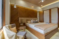 Son Bedroom-2 achieves a stylish and serene ambience with the warmth of teak wood in the backdrop with the clean combination of PU finish for furnishes.