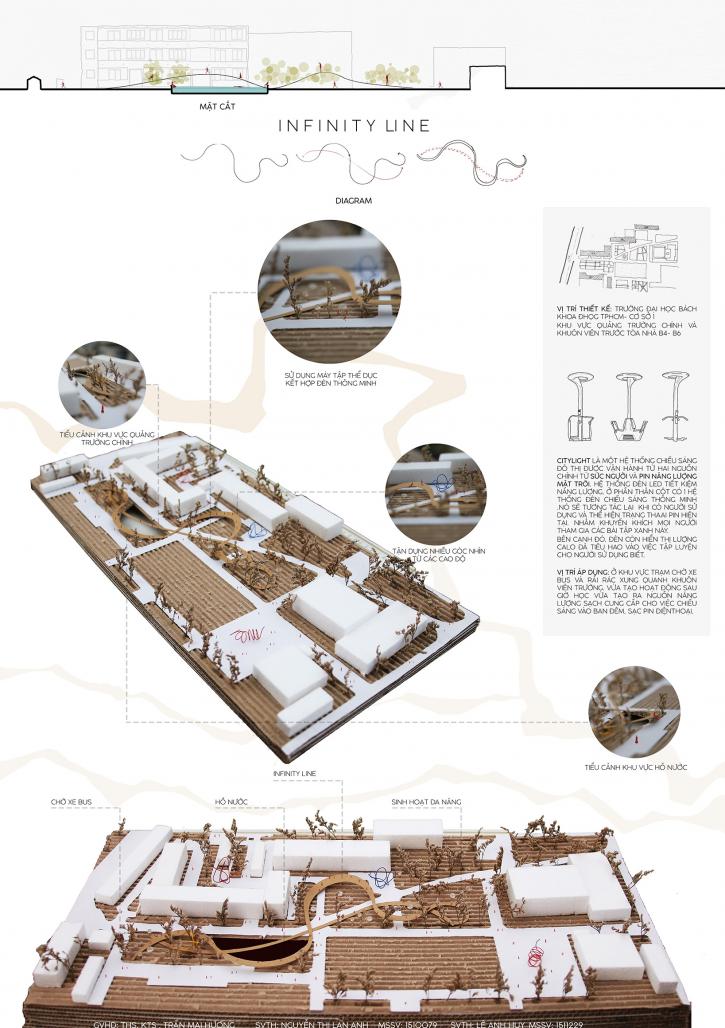 Infinity loop is a university yard renovation project. This project located at Ho Chi Minh University of Technology, one of the most famous universities in Vietnam. I myself am a student of this university. Every day I walk on the same path to class, it makes me feel boring, so I want to bring a new space between the old blocks, bring a soft curve. between those square blocks. The Infinity Loop is a winding path with many different levels from which to create many interesting views and various functions according to each level. This will be the main space for after-school activities and sports activities, helping students easily connect with each other. The project is divided into main functional spaces such as bus stop, water surface space, outdoor square, green sports space with modern exercise equipment. In addition, the project also applies some advanced technologies called City Light. This is an urban lighting system that is operated from two main sources: solar energy and human power. Connect to exercise equipment arranged around the path, so students can both exercise and generate enough energy to provide lighting. This is considered a new trend, encouraging people to use green energy. With the help of City Light, after-school activities can last longer thanks to adequate lighting conditions, so that the school yard always keeps its required dynamism and bustle. As the name itself suggests, the project creates an endless loop where each step of the students is a completely different experience.