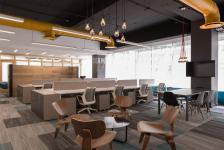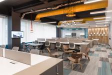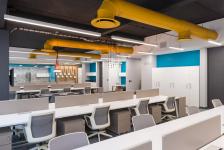 In the central part, services such as bathrooms, storage, site and lunch room were located. The lunch room has a double function, since it can also function as a larger area for internal training and meetings. The materials used were modular carpet, engineering oak floors, porcelain and glass. The color palette is focused on neutral gray and its wide range with bright aqua blue and yellow accents bringing dynamism to the overall environment.