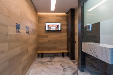 Materials: Wood, marble, porcelain, glass, modular carpet