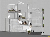 The facade with two-layer design includes: steel louver outside and sliding glass door inside. Between the two layers, there is an trees along the facade. The steel louver system has the effect of shading, filtering and taking in light during the day and closing against intrusion and ventilation at night because of its flexible opening and closing ability. The flexibility of this Double Skins system allows the house to be ventilated and maximizes the amount of wind and light entering the house.