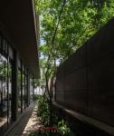 The floating staircase that climbs along the dark titanium wall merges the solids and the voids of its surrounding living space, while the adjoining courtyard runs through the full height of the building, like a titanium and green core connecting all the levels. This courtyard and the void above the entrance and its thin-leaved tree framed by the semi-permeable façade, are the only hints to the vertical depth of the building. Another noticeable feature is how the landscaping characterizes the intermediate space between the interior and boundary of the site. These edges are defined by the low hedges formed by shrubs and plants of a few vibrant flowers that seem to peek through the greenery where the monotonous horizontal lines are broken by the small trees and the alternating solids and voids of the boundary fence.