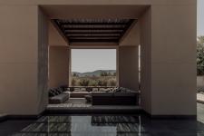 The architecture’s material palette is defined by warm grey tones, textured surfaces that invite the touch, and the region’s abundant nature of wild olive trees, palms and pines. The terracotta hues of Greek ceramics found on the island played a key role in the choice of colours, while Italian cotto tiles, stone, timber, terrazzo, butter-soft leather and ethereal fabrics, provide layering to the composition. At the same time, the project’s planted roofs further enrich the scheme’s green element. This feature also supports the region’s biodiversity and ecosystems.