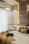 The Son’s bedroom has been rendered with the grey color scheme, sliced in a pattern in the headboard, continuing from the backdrop with raw stone texture and mirror grids. The toilet door is camouflaged with the storage with PU finishes.