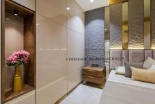 The bedroom on the ground floor belongs to parents. Here, the simplicity reflects through its white PU finishes and warmth of veneer finish. The tufted pattern of the bed highlights the whole room.