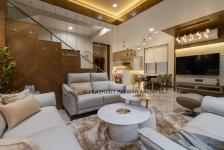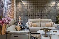 The Drawing room is highlighted with geometric-patterned wall as a backdrop to seating , creating an essence of dramatic yet cozy ambience. The monochromatic Italian leather material of the sofa furniture with stylish round-centre tables add luxury and comfort to the space.