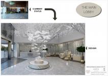 The idea of a tree-shaped steel column with branches reaching up to the ceiling (the foliage). And the concept of 'Visual highlight' is a pendant light with leaf modules and an ornamental pond that evokes the image of leaves falling to the water surface in nature.