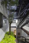 The main access to the building is through a lobby connected with the vertical circulations, the bridge staircase is an important element of the design, dynamically arranged and located in the central courtyard conducting the user’s course with small floating green areas.