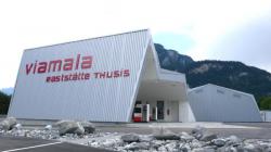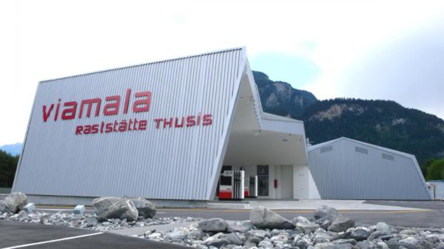 The Viamala Raststätte Thusis was opened on 12. june 2008. The roadhouse offers a restaurant with 160 places, a terrace with 60 places, bar, 140m2 shops, conference room, a fuel station and a parking area for 140 cars, trucks, buses. The hole area was designed by Iseppi / Kurath GmbH. The architecture is highly influenced by the sourrounding landscapes, mountains, views, materials. The chosen material consists out of steel on the elevations outside. The interior is covered with wood.
