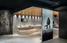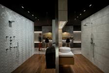 On the first floor of the showroom, the client wanted to introduce a sanitary ware and wallpaper brand. So, various mock-ups are created of washrooms, living areas, bars etc. from which an architect, an interior designer can just select a complete concept for his house. For example, each washroom mock-up has its own concept with matching tiles, wallpaper, vanity, sanitary ware, faucets, furniture, ceiling elements and lighting. In the central aisle, a few free-standing partitions are erected at angles to create a feeling of mystery. Every step ahead takes the person through a new journey unveiling the different mock-ups ahead. An architect’s display area is also created on this floor. Since white colour tiles are most commonly used in all facilities, we decided to dedicate an area for the white tiles with various patches. Here the tiles can be showcased for various applications using temperature changing lights from yellow to bright white.