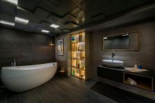 The showroom was intended to be placed on the ground and first floors. When a person enters the showroom, to create a sense of volume and to connect the two floors, the existing RCC slab is cut to create a double-height space with large hanging ceiling lights over it. A reception table clad with 8 feet x 4 feet slim tiles is kept in the middle with the famous Barcelona chairs adorning the visitor area. The double-height wall also has a backlit panel with the initial concept sketch of the building. On the ground floor, a central aisle is planned with separate zones on both sides. These zones are created for different brands and kinds of tiles where each zone has display cassettes and tiles are displayed in different patterns and combinations making it much easier to select. To create the desired dark interiors, the partition walls are clad with dark coloured tiles and multiple niches are created to display contrasting décor tiles. The ceiling and the exposed services are painted dark grey and panels of tiles are hung using MS framework to show creative application. In some places to bring relief, cement grey texture paint has also been used. The ground floor also has an architect’s display area, where he/she can move in, select tiles, put them on a slanter and make concepts for their space. Also in this area, the temperature of lights can be varied from 2700k to 5000k according to the space it has to be fixed in.