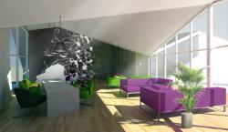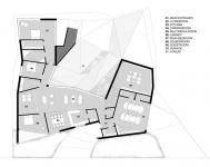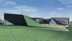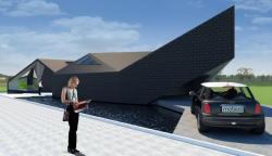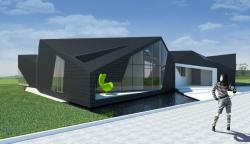 We designed a one-storey house which is located on flat building plot. There is an inner atrium with the view of the surrounding fields. Its floor surface is 320 m² and it is meant for a family of four. The solid is mostly defined by the roof. Its inclination was supposed to meet certain conditions {25°-40°}. The use of a natural graphite stone on the walls and the roof emphasizes a cohesion and minimalism of the solid. The closest surrounding of the building was designed as multi-textural mosaic which is a reference to Japanese gardens. Shallow water bodies are characteristic elements. Especially the one at the front of the building. Since there is no fence, it is a barrier between the street and the house.