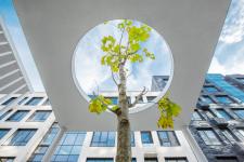 By the river, the axis of the boulevard opens up into the second large zone, the green square. The quiet area of the square is located next to the office and shopping center, while the active area is by the apartment building. The green square has smooth natural shapes and provides contrast to the straight boulevard all the while harmonizing with it through the geometry of its elements.