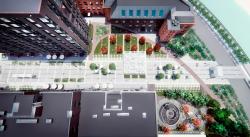A pleasant pathway invites pedestrians to examine shops and cafés located on the ground levels of the buildings as well as to visit the office and shopping center.