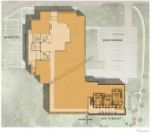 While respecting the brutalist solidity of the existing Surrey Courthouse, the design of the addition responds to the desire for a justice system that is not only enduring and dignified like the existing facility but is also more transparent and welcoming. The existing glass and concrete material vocabulary is reused and enriched. The courts and secure holding areas are embedded within a two storey concrete mass. The public atrium and the third floor judicial functions are housed in a three storey glass volume that intersects the concrete mass. Douglas fir sleeves mark entry points into the courts and public interview rooms. The courtroom interior is lined with horizontal bands of micro perforated Douglas fir embedded flush into the concrete shell of the walls providing acoustic performance as well as warm character. The ceiling is inflected focusing attention on the dais as well as allowing sunlight to penetrate deep into the courtroom through an opening in the concrete shell that allows borrowed light in from the adjacent public atrium.