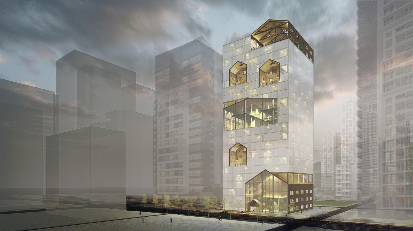 To fit in the residence, the company which comes in should be residence-friendly. The most three important things in life is food, clothing and shelter. Company which treats those three factors can mix with people there while bringing the flow of Teheran Blv. Therefore gap between the two areas would be narrowed and synergy between them is expected. Residence-friendly company can also interact with people near there. So we chose to design a office building for a “lifestyle brand” company. It can offer several culture programs related to people’s life and by doing that the image of the company will be enhanced. To symbolize the contents of the company, we decided to borrow a shape of gable so that people can recognize the company image intuitively. Also, by changing the factors that are originally inside house and outside house inside out, the building is composed of various unique and fresh spaces. Workers feel comfortable in house-like working spaces and get refreshed and motivated in outsied-like, house shaped spaces.