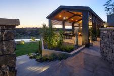 The central living space on the ground floor is under a pitched roof, shared with a terrace and enveloped by guillotine windows on the west façade that can be fully opened, providing an immersive outdoor experience. This facade features a landscape band reserved for the lush purple Fountaingrasses. Given the Mediterranean climate, the building enhances the outdoor experience with herb and spice gardens, an inviting infinity pool, an outdoor kitchenette, and abundant spaces for the extended family to relish. Sustainability is a key consideration, with design elements like a compost pool emphasizing environmental consciousness.