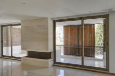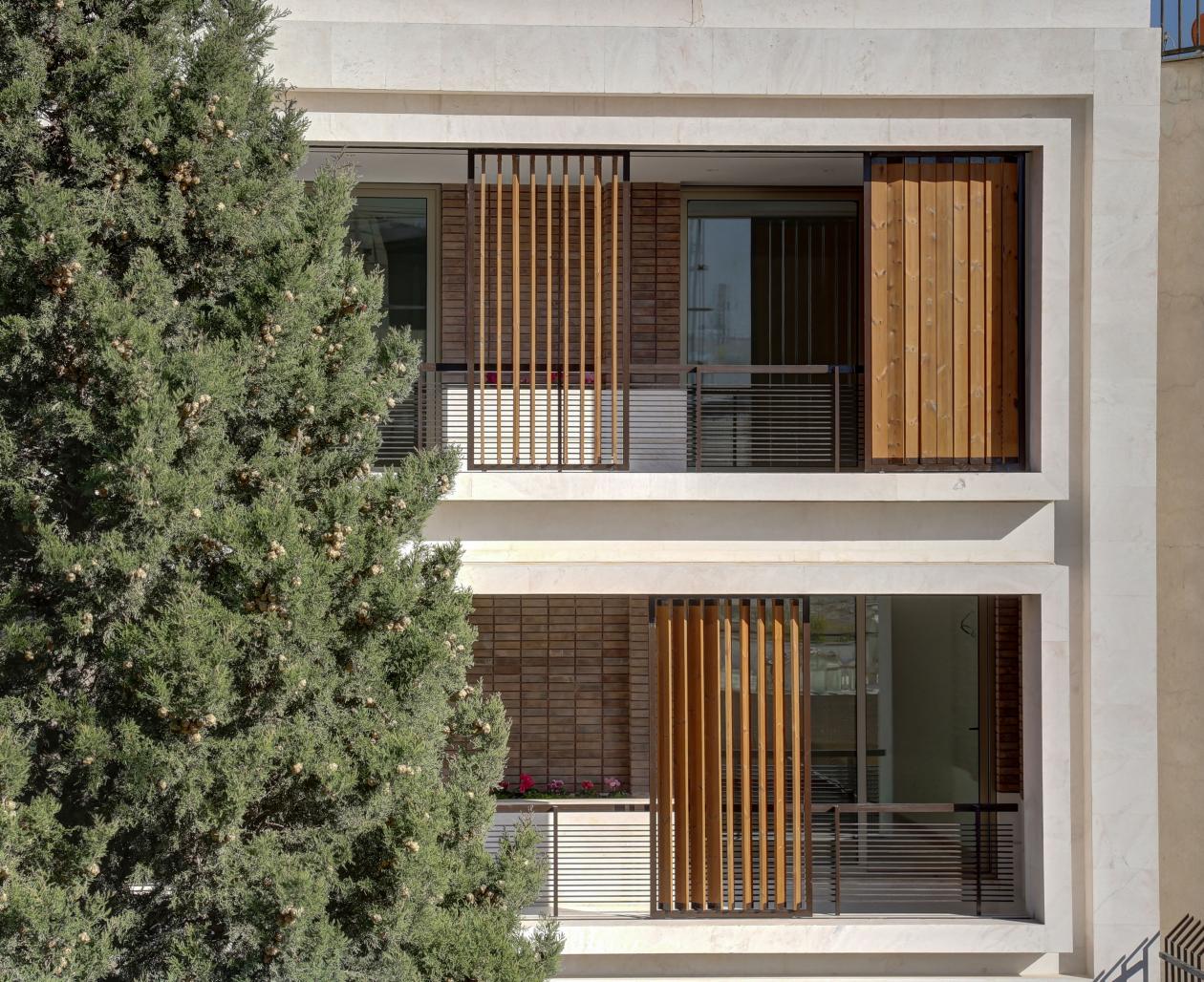 As mentioned the increase in residential space area, considering large terrace in front of building, facing the yard, was possible. Larger traces mean combining outdoor and indoor, increasing sense of vitality and finally increasing the quality of living. And also, with the construction of a four-level building on the other side of the alley, two tertiary panels with wooden sprockets were used to preserve the privacy of the terraces by moving these panels and rotating the angles of interior space without spaces, different light and shadow plays occur on the terrace. In the ancient architecture of Iran, lights and shadows played an important role in buildings, even small ones (including residential building), wooden ornaments of windows and colorful glasses were the examples of light and shadow importance, in this project, the wooden ornaments were modernized and wooden shades give the space high quality. As mentioned these shades also provide the need of privacy in this residential project.