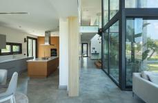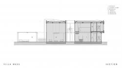 Villa Mass boasts five distinct rooms, complemented by inviting outdoor spaces that enhance the overall living experience. An outdoor kitchen, with convenient access to the primary kitchen indoors, extends seamlessly from the dining area to the pool, creating an ideal setting for al fresco dining and relaxation. Each terrace surrounding the villa is thoughtfully designed with different top coverings to accommodate changing sunlight angles throughout the day, ensuring that these spaces remain enjoyable at various times. Additionally, the villa features a 15-meter-long pool, complete with a circular seating area at one end. The pool terrace is strategically positioned to maximize the interplay between the concrete surfaces and the surrounding landscape, maintaining the villa's distinctive design balance.