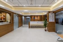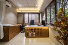 The reception and the waiting area are a neatly designed space with a minimal approach. What brings tranquility here is the technique of using veneer and tiles on walls. The use of tiles made it maintenance free space.
