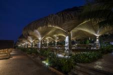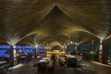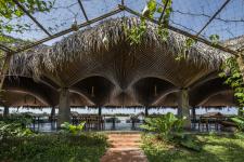 The roof is the highlight of the building. The rhythmic shaping of the roof makes the building be recognized easily, but still be harmonious with river and coconut forest surrounding the building, that is thanks to the reasonable proportions and the typical local coconut leaf roofing material. The roof structure consists of main bearing steel frame system in the middle, the steel purlins and roofed coconut leaves above, the hanging bar system and bamboo trunk ceiling below. The ceiling is designed rhythmically, simulating the ripples to make an impression for diners.