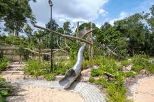 Children can duck, swing, and hide amongst the vines of the Banyan Tree Tower and its impressive branches, giving them the chance to get up close and personal with this magnificent tree species. For an additional pop of thrill, two tube slides of varying heights and lengths allow children to quickly whoosh from the canopy of the tower to the ground, before beginning their ascent once more.