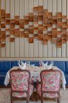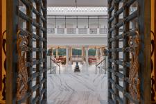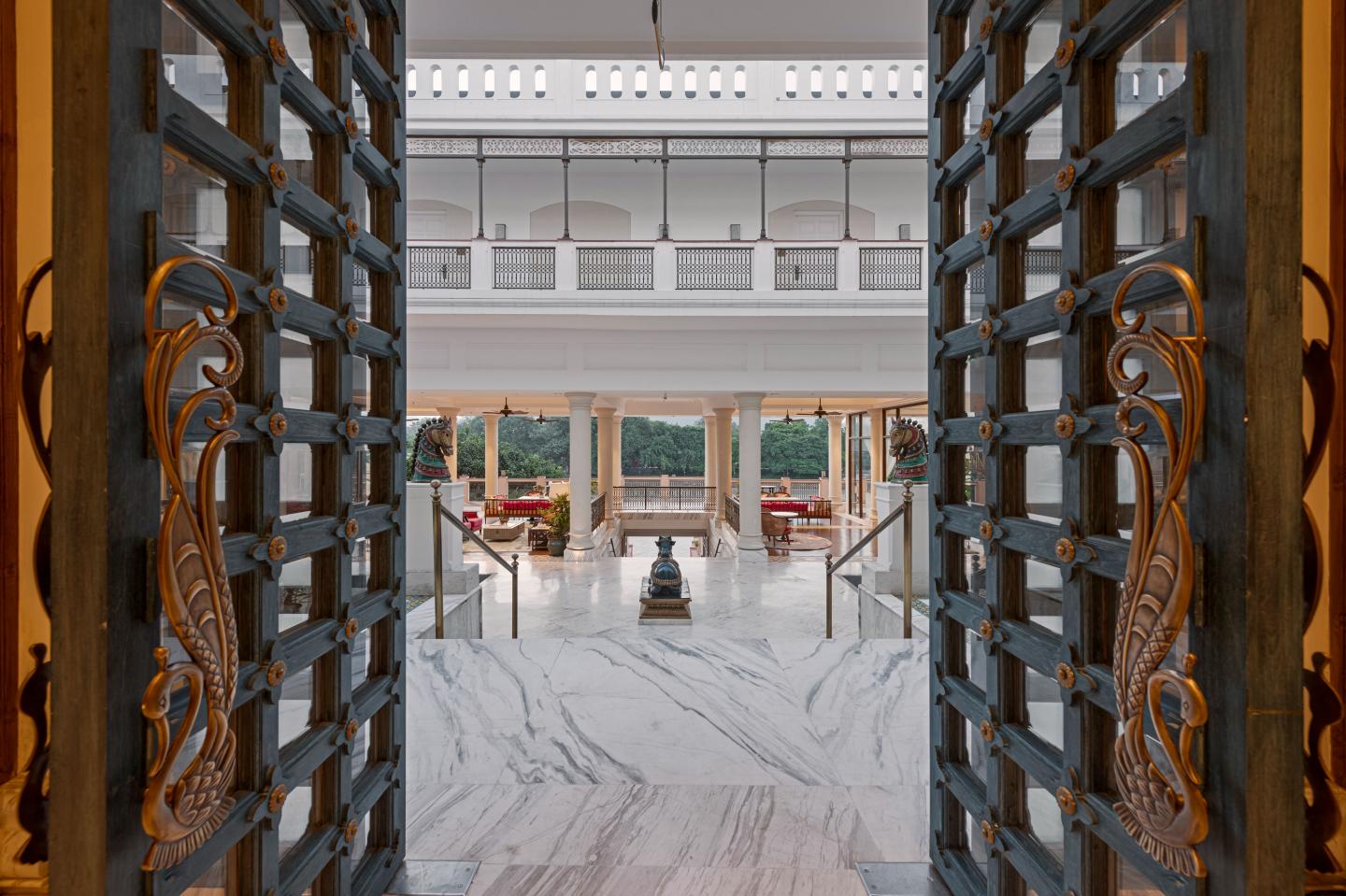 The hotel situated along the banks of the river Ganga was effectively divided into three sections: entry, courtyard, and lounge, all leading toward the holy river. The entryway symbolizes Dharma. The large entry doorway is recreated to be exemplary of the original doors coated in antique blue of Neelkanth. The colours of Ganga and Neelkanth were instilled, reflecting through the doors and windows. The entryway ensured the guests could feel the energy between the two doors, where the ancient artefacts carry the memory and history of the haveli. The courtyard becomes the next space that guests enter emphasising the relationship to Artha. The courtyard provides an unobstructed view of the lounge and several rooms. Both the ceiling and flooring are adorned with intricate carvings. The view from this vestibule is unparalleled. The ripples of the coordinates can be seen in the design of the courtyard. The lounge is attached to the courtyard, which further leads to the holy river.