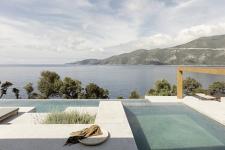 Block722 architects were called to create a private holiday home, joined by a separate structure that houses four guest rooms. The plot is located on a cliffside overlooking the blue waters of the Ionian Sea. Entering the site from the topmost side, visitors are guided down to the main house via a wide ramp. From there, a series of paved terraces and a narrow, natural path lead to a small, secluded rocky beach below.