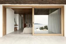 Stepping in through the front door, large skylines and a clear line of vision across the living room and towards the sea beyond, instantly introduces a sense of spatial drama. Further inside, the main house contains a large open plan living space, flanked by a master suite and two further bedrooms. A separate outdoors din-ing area and a shaded, fully equipped barbeque kitchen are placed next to a swimming pool. All rooms fea-ture iroko wood-framed, floor-to-ceiling glazing towards the water, with the living area including openings on both the rear and front facades.