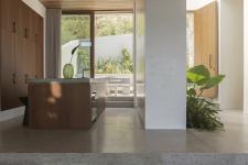 Natural materials, in both the main home and the guest houses, complement the plastered concrete con-struction and nod to the wild Mediterranean vegetation around the site. As a result, the interiors are mod-ern, but also feel tactile and richly textured. The floors are either natural stone or terrazzo made locally by a specialist craftsman. A contemporary wooden ceiling made of teak slats becomes a central feature in the living spaces. At the same time, bespoke solid timber doors enhance the overall sense that this retreat is anchored in its site, intrinsically connected to its context.