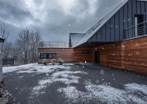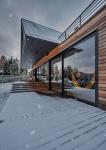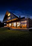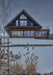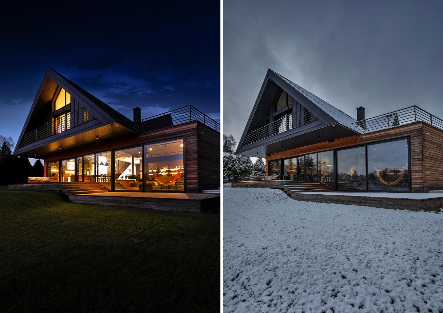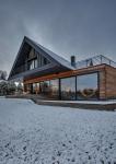 A ground floor from the entrance and the garage entrance side is connected with the existing ground level. Then in the living area – kitchen and dining room – the level is slightly sloping, opening the high interiors onto the magnificent view. Further down, directly on the ground level, the living-room space is located. In the central part of the living area, where we placed a fireplace, a multi-step drop is formed. It cuts through the glass pane and is continued outside. The inside part of the drop forms a seating space, a form of a multi-level auditorium or unusual guest space arrangement. Outside it forms contemporary arcade stairs, a dynamic stylistic accent, binding in a harmonious way the ground-floor solid with the gable form of the soaring attic. The minimalistic solid of the attic, enclosed in a puristic triangle and tucked with the roofing sheet creates a distinct arcade, protecting the house against sun and rain. From the south side the attic houses the interior of a scenic bedroom, open up to the ridge and from the north side – two-level study with a mezzanine on the highest, already fifth level. The ground floor, which is modernist and entirely glazed from the south side, was finished with naturally patinating and aging wood, as seen in historical eaves houses. The contrasting, expressive form of the attic was finished with the use of modern material, which defines the precise architectural detail. The Lesser Polish Eaves Cottage is a designer house, but in the same time it is durable and timeless, as it is firmly rooted in tradition…and in BXB studio we strongly believe that this is the factor which makes it something more than just another modern building.