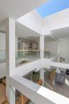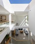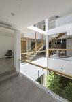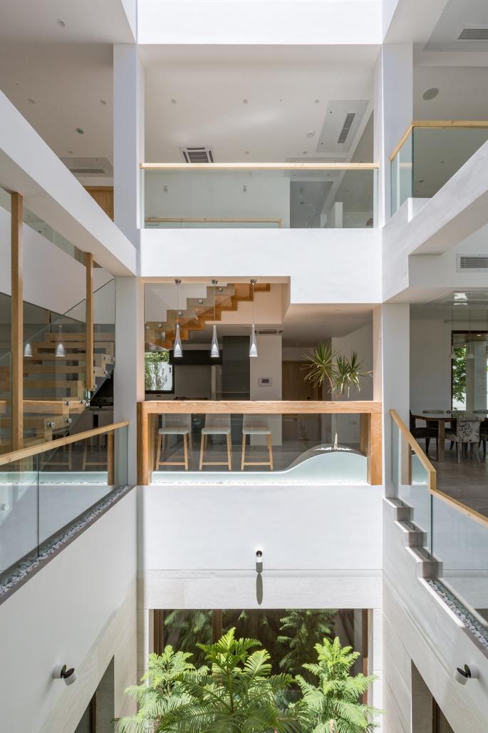 The floors are connected with one elevator, while the stairs wrap around the void creating magnificent views throughout the house; it means vertical connection between floors take place in different spots by distinct visual experience and spatial quality.