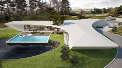 The building is designed in a style with maximal “air”. There are an open internal terrace and big transparent picture windows, which enable observation of the rest of the architecture from internal space of the building. The distinguishing features of the building allow maintaining of internal temperature and ensure panorama view of outskirts within 240 grade angle. The operation of light dominates, while impetuous smooth lines allow the light to better show its worth. Monolithic concrete curves of the building set their own architectonical calligraphy which shapes a signature of the authors’ tandem.
