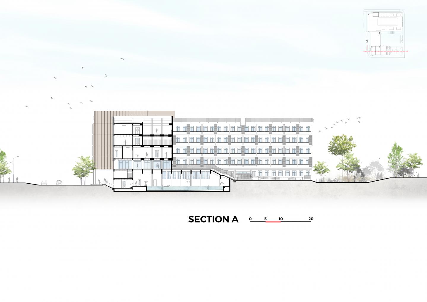 In addition, the roof space is designed to catch up with the trend of green architecture and save energy. A considerable area to arrange an experimental garden on the roof with a variety of systems of small plants, serving students' learning and exploring nature.