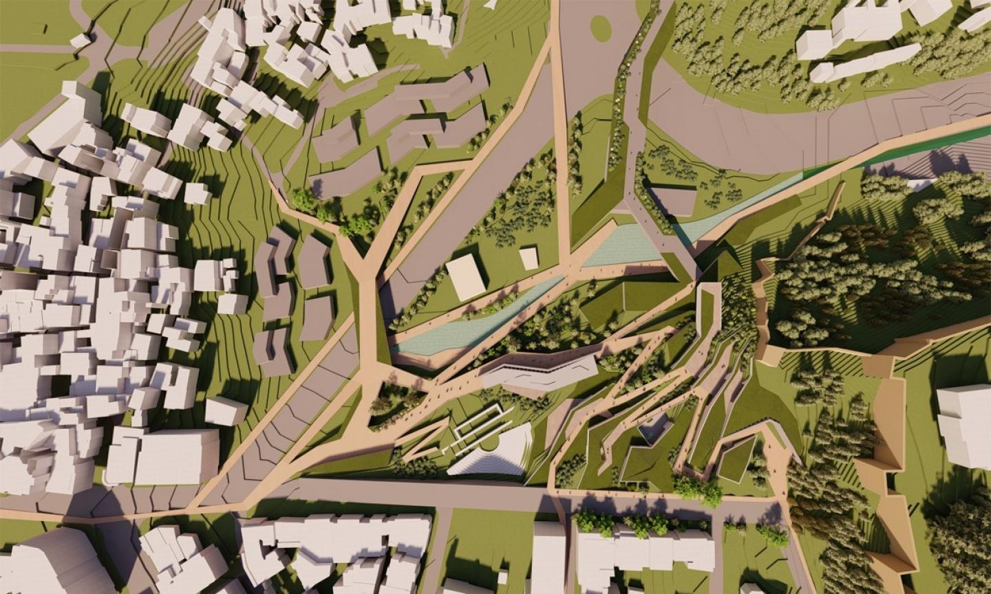 The building masses are shaped and placed according to the steep landscape and the pathway created to connect cultural and historical axes. With the help of this connection, the building acts as a bridge. Then the number of masses is minimized to create a more compact layout. By integrating the building with the topography, terraces are created on different levels. To get the natural light in, the green roofs are tilted while also enlarging the interior space. Lastly, the façades are adjusted according to plan layouts. Taking references from the surrounding topographical shapes, the edges of the buildings are extended giving the façades carved-out-stone type of look.